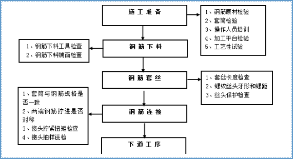 說明:本流程圖反映的是一個(gè)合格的鋼筋直螺紋套筒連接施工工藝。如果某道工序經(jīng)自檢不合格,不能進(jìn)行下道工序施工。