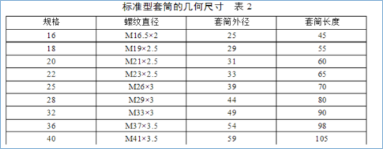 剝肋滾絲頭加工尺寸應(yīng)符合表1的規(guī)定。絲頭加工長度為標(biāo)準(zhǔn)型套筒長度的1/2,其公差為+2P(P為螺距)。