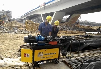 正在開工中的桂林漓江橋擴建工程工地現(xiàn)場,鉆機、吊機、裝載機 紛紛開動,固力士套筒及設備也有序進入了工地現(xiàn)場,漓江橋擴建工程是桂林市2015年度“重中之重”項目,工期緊、任務重。為了聯(lián)合大橋局加緊工程項目,深圳市固力士建材有限公司工程部牟經理連夜趕到工程現(xiàn)場進行技術指導,克服困難,加班加點,為工程保質保量順利施工提供一切有利的技術支持。目前,桂林漓江橋擴建工程鋼筋連接設備已全部正常運行。